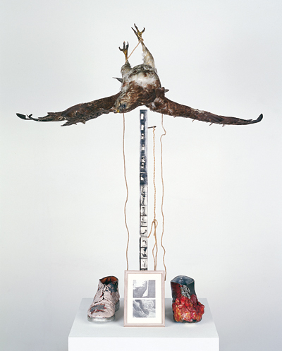 Holzplatte mit aufgeklebten Fotos, präparierter Bussard, Schuhe mit Wachs,